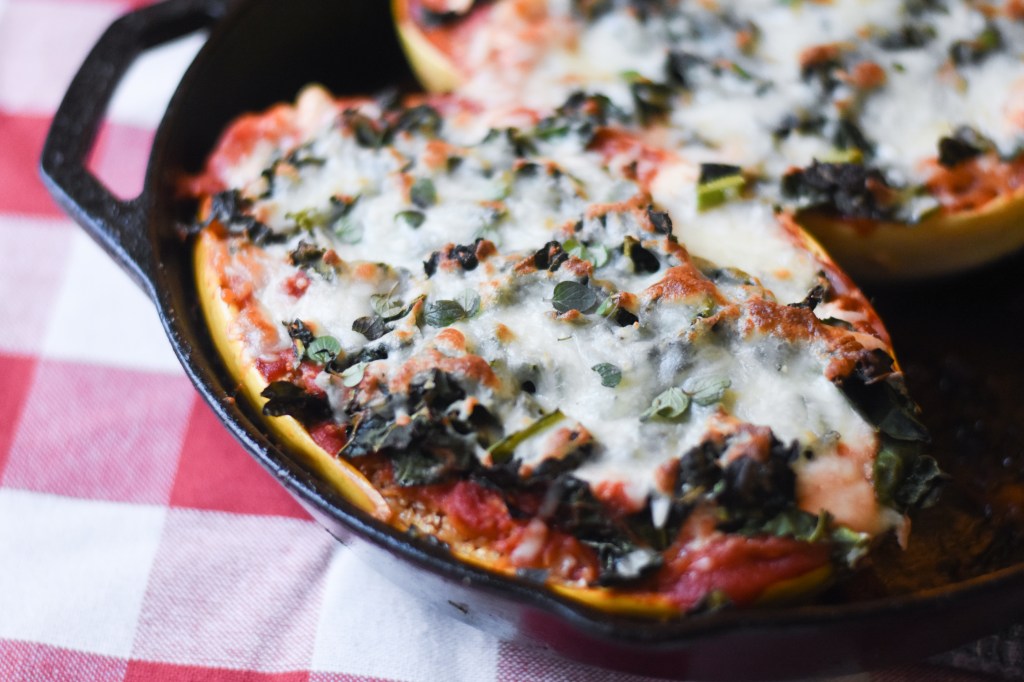 - Push kale down into the squash. Top each half with 1/2 cup shredded Mozzarella. Return to oven or broil until cheese is lightly browned and bubbly.