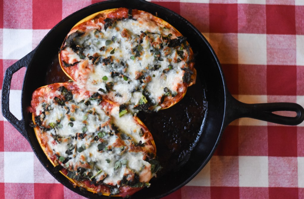 Spaghetti squash has been a normal part of our fall and winter dinner rotation for years. While I do also eat pasta and carbs, I love vegetables too, and I’m always happy to get extra veggies into our meals. We have roasted spaghetti squash with tomato sauce and mozzarella many times over the years, but recently I added some leftover ricotta too, and it made it feel more like lasagna.