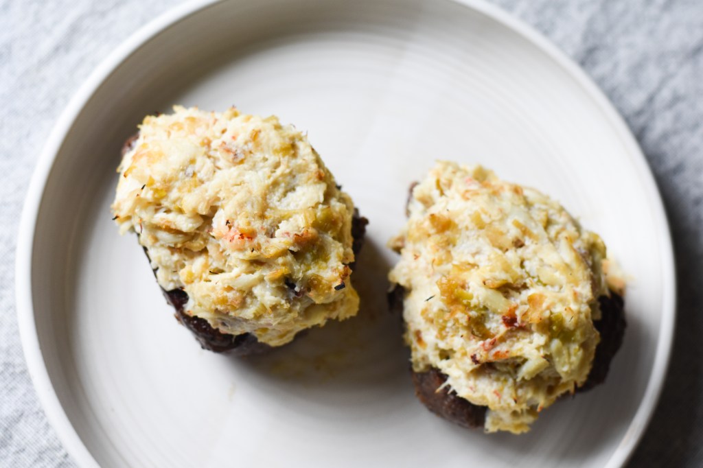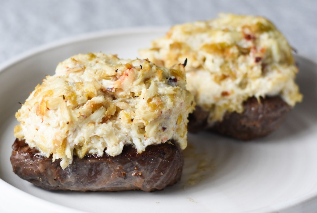 - Carefully top steaks with crab leek topping, distributing between each steak. Press it down into mounds onto the steaks. Add 1 T butter to pan, allowing to melt. Using tongs, carefully run each steak bottom through the butter.
