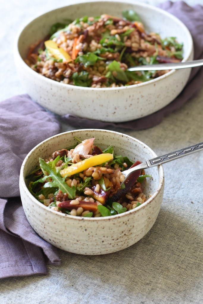 For this recipe I recommend using farro or barley. Both provide nice chew, flavor, and plenty of nutrition. The cooking time and method for these grains depends on the particular type you are using. Pearled or semi-pearled grains have some of the grain removed and cook up faster. Follow your package directions if provided. It is important to rinse both beforehand to remove the excess starch so it’s not sticky. Also make sure to salt your water for the best flavor. When in doubt on the best method, cook like pasta and just check periodically for doneness. You want them to have a nice chew and not turn into mush.