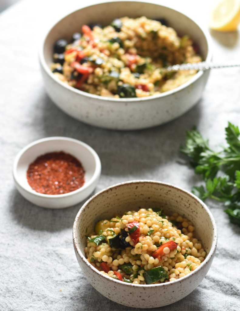 I like pearl couscous in its most simple form, but it’s also a great canvas to build on. Here grilled vegetables, lemon, and plenty of parsley make it extra special. The olives are also very important to me. I prefer dry cured black olives here such as Black Beldi for their mild fruitiness, but I think the first time I made this I used Kalamata olives. My husband isn’t an olive fan, so generally when I make this now I just serve them on the side.