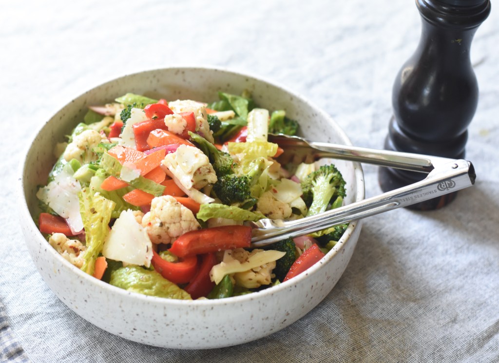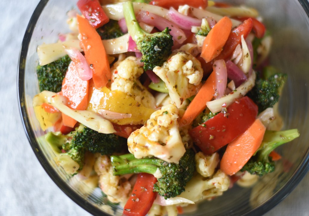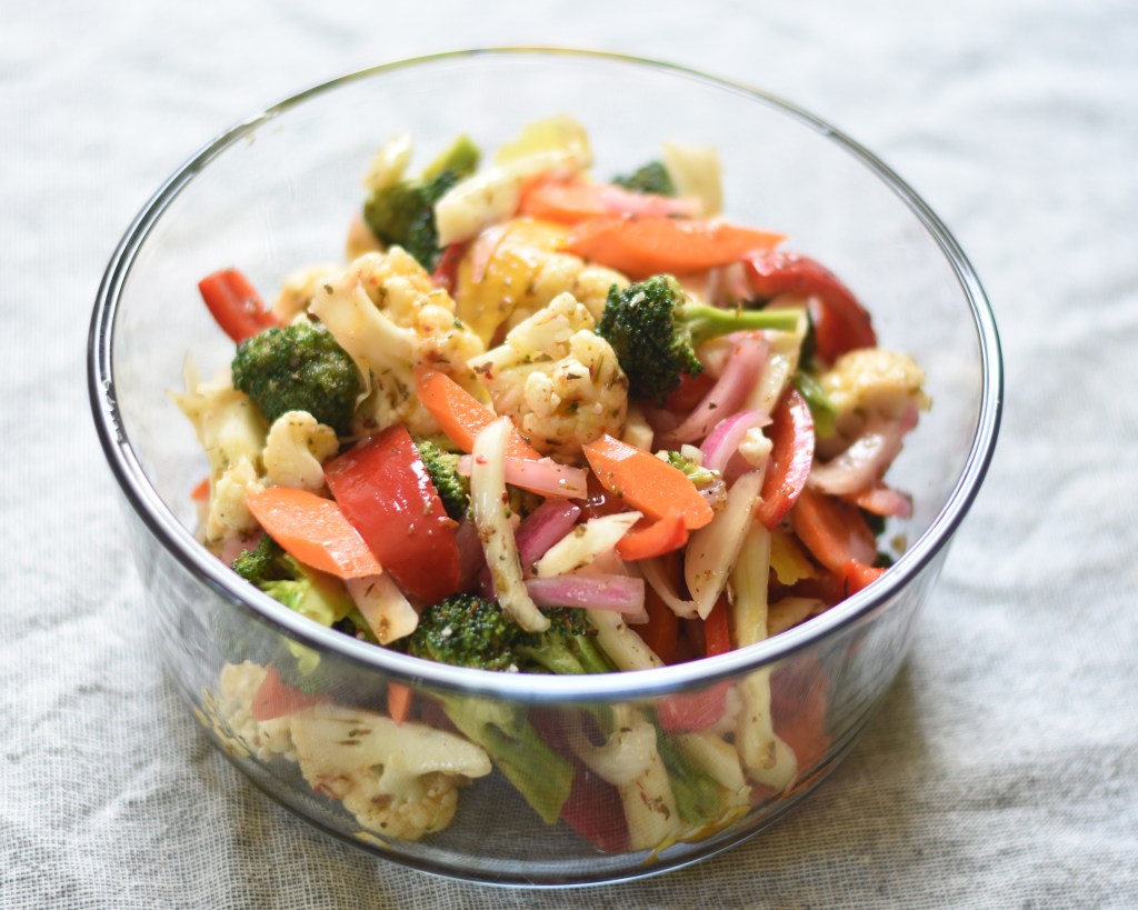 - Toss vegetables with vinegar, oil, Italian seasoning, minced garlic and crushed red pepper flakes.