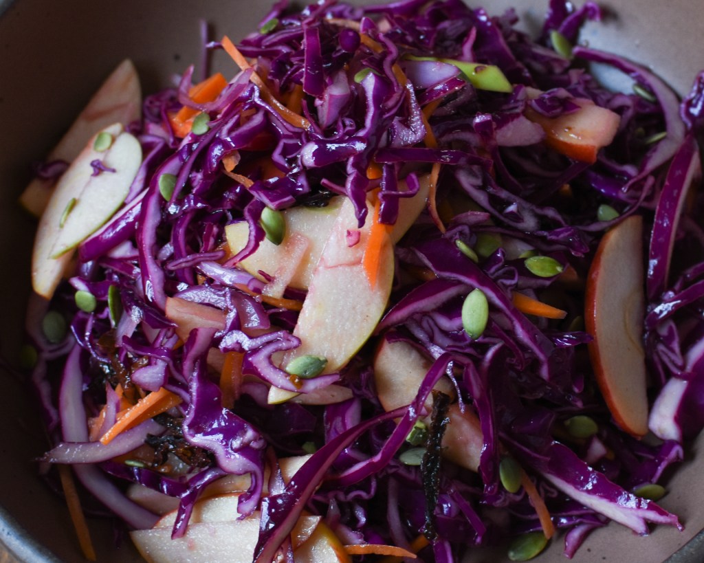 I use predominantly red cabbage here for the beautiful color, but I threw in a little green for contrast. You can use all red, or even all green if you prefer. There is also kohlrabi in this salad, which provides more crunch and a bit of extra bite. They have a pungency similar to radishes, so if you cannot find kohlrabi, feel free to use thinly sliced radishes instead. Kohlrabi doesn’t have to be completely peeled, but you should cut of the fibrous bottom and top. You’ll see some of it is a bit thicker, and you can slice that away too. Otherwise the skin is edible and it also has a gorgeous purple color.