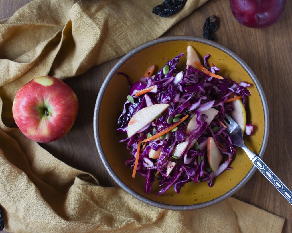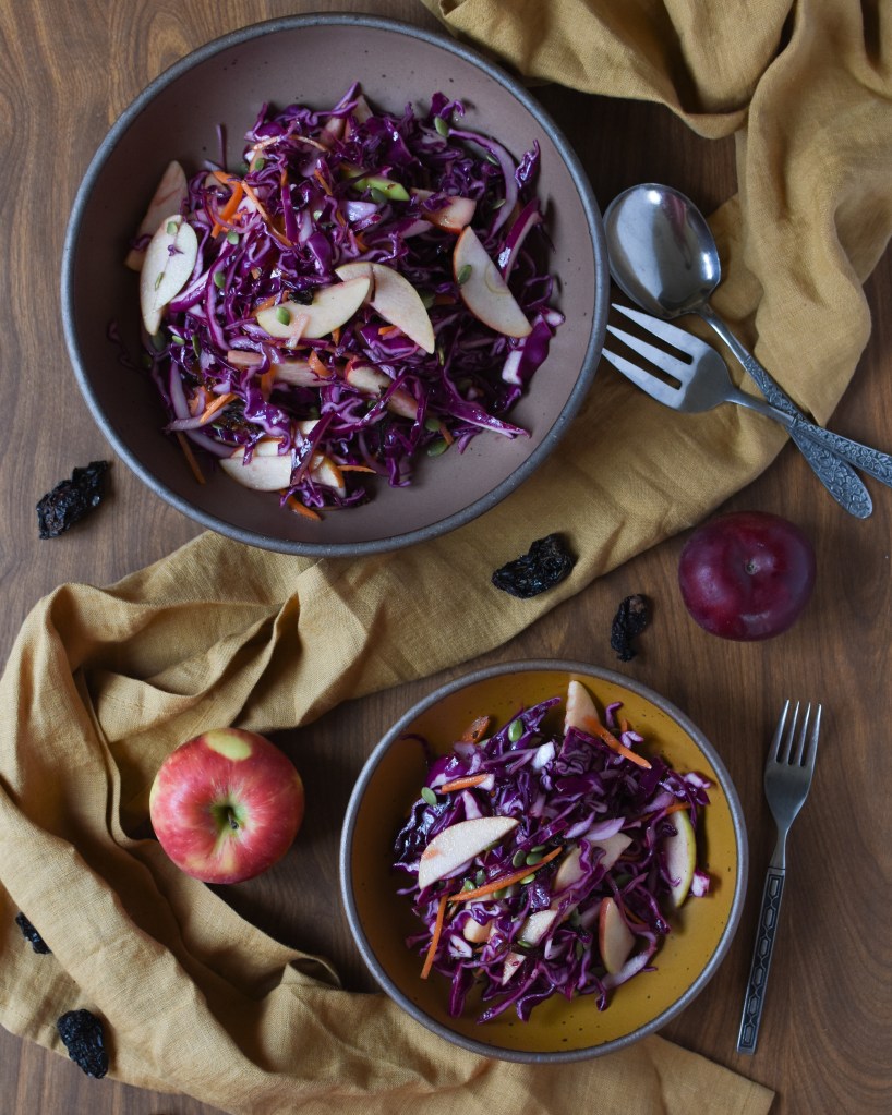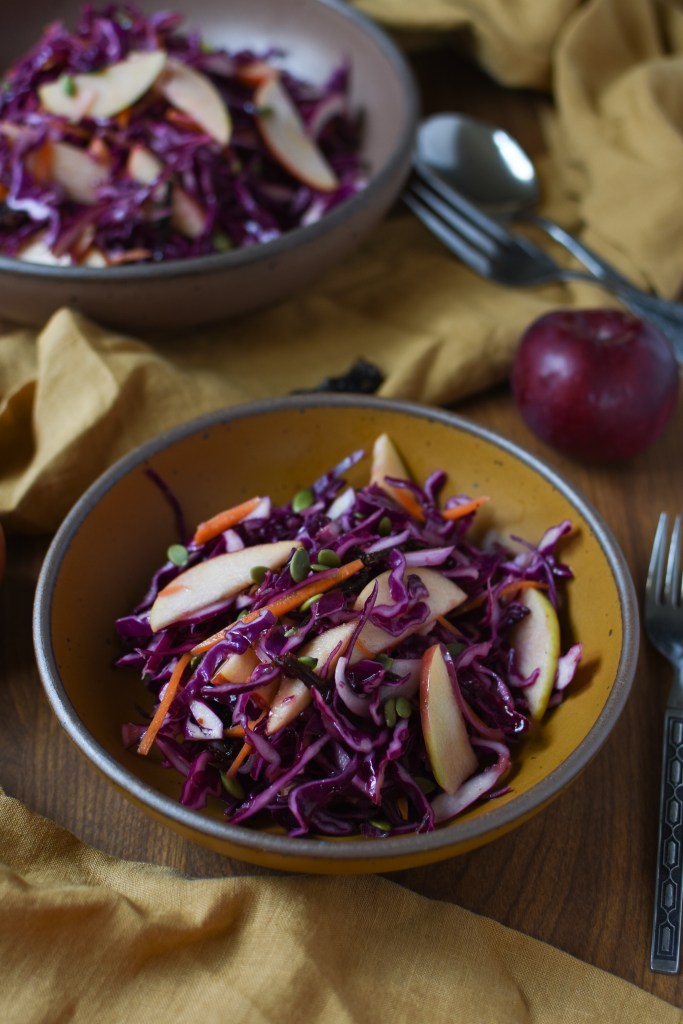 I recommend making the coleslaw at least four hours in advance, but it can be done a day early too. The cabbage holds up really well, and it seems to improve as it sits. The apples are best if added the day of, but I still really like it leftover. It makes a great lunch. This would also be perfect with grilled chicken, pork, or fish, or crispy tofu if you want to keep it vegetarian.