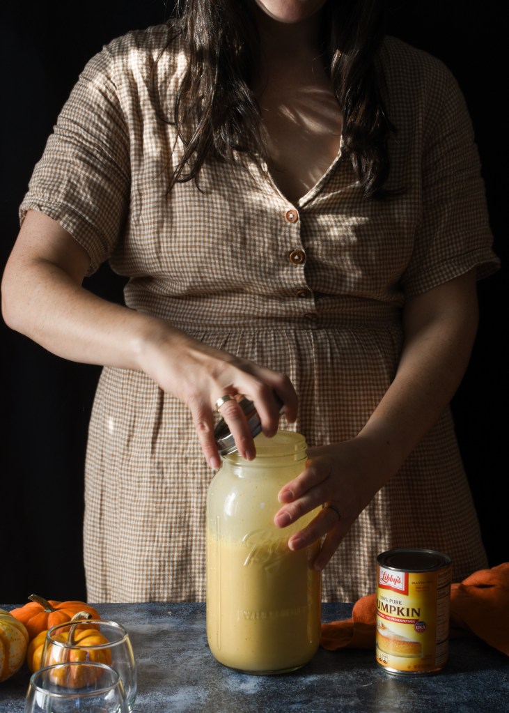This recipe uses raw eggs. Generally I’m drinking it immediately and I don’t want to wait for it to cool. If you’re squeamish about raw eggs, you can whisk the pumpkin, cream, milk, simple syrup, and vanilla extract together and then heat in a sauce pan until tiny bubbles start to form. Then gradually temper it into the egg yolks. You’ll then have to wait for it to cool before adding in the egg whites.