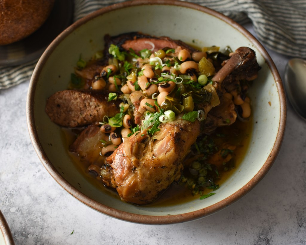 Black eyed peas are thought to bring luck to those who eat them on New Year’s Day. This preparation is so rich and flavorful, even those who don’t need luck can enjoy this dish. Although I put cassoulet in the title, this recipe is largely influenced by African American and Southern cuisine. Black eyed peas were originally brough over from Africa and cultivated in the United States by enslaved people. (I highly recommend reading Michael Twitty’s book, The Cooking Gene if you want to learn more about African American culinary history. It’s fascinating.) It’s loaded with meat: ham hock, sausages, pork belly, as well as bell pepper and collard greens. There is also confit in it, which is a usual component of French cassoulet. I use chicken here, but you could also use duck if you are feeling fancy.