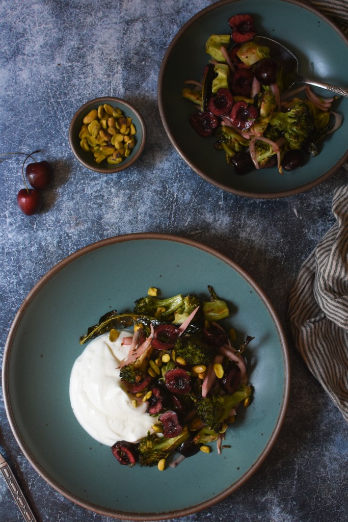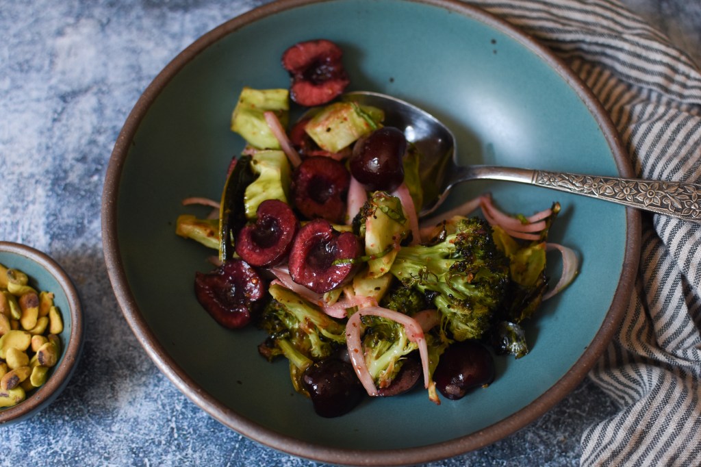 - Thinly slice the basil. When the broccoli is done, allow to cool for a bit. I like this salad warm or at room temp. When ready to enjoy, toss the brocolli with the onions, cherries, and basil. Garnish with pistachios and serve with yogurt, if desired.