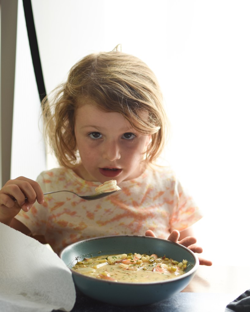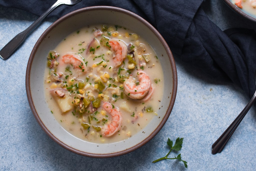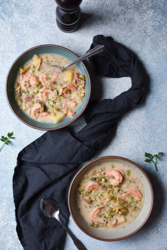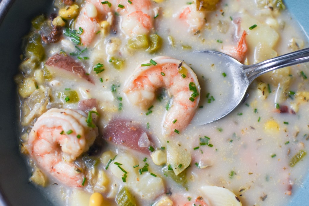 I made corn chowder a few weeks ago when I had some extra corn from our CSA. I gave it a bit of a southern vibe, with green bell peppers and Chesapeake Bay seasoning. I decided then and there that next time I would add shrimp. It’s Phillie’s favorite seafood, and I knew it would round out the flavors well.