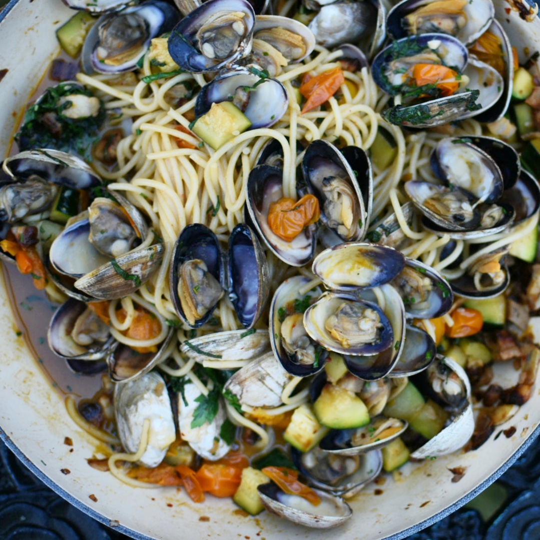 This is a delightful summer dish inspired by many dishes from my former line cook days. However, we were never this generous with the clams in our pasta dishes. Think of this dish as clams with a little pasta there to soak up the delicious broth. It makes two hearty portions for dinner for those