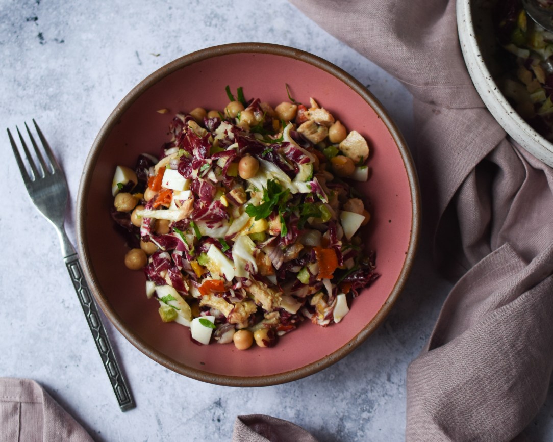 When I first threw this together a few weeks ago, I did not plan on it being a recipe I would blog. It was a quickly tossed together lunch that I knew would fill me up before work. I chopped up some radicchio, added some canned chickpeas, and then decided to add tuna. I happened
