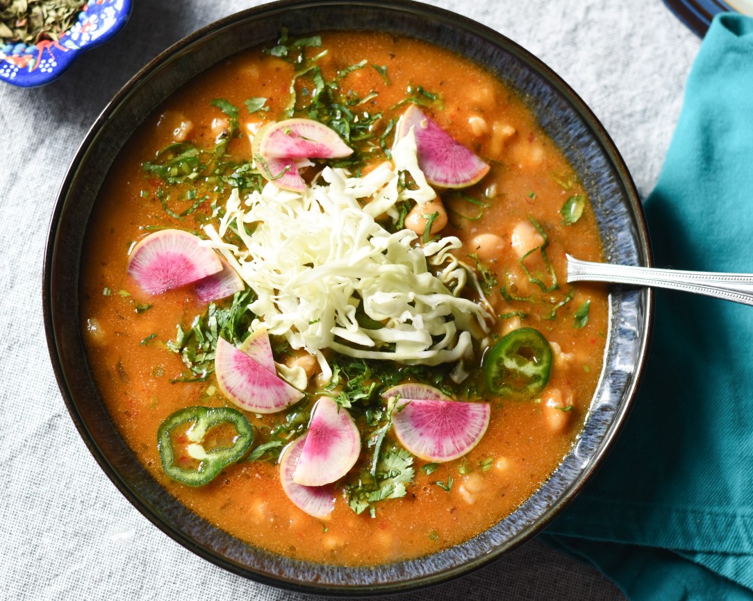Traditional Mexican pozole is rich, meaty, and full of flavor. I absolutely love it. This pozole skips the meat, but is still full of flavor. Toasted chilies and cabbage are pureed into the broth for viscosity and depth. I added beans for protein. Hominy is full of a deep corn flavor, and provides a deliciously