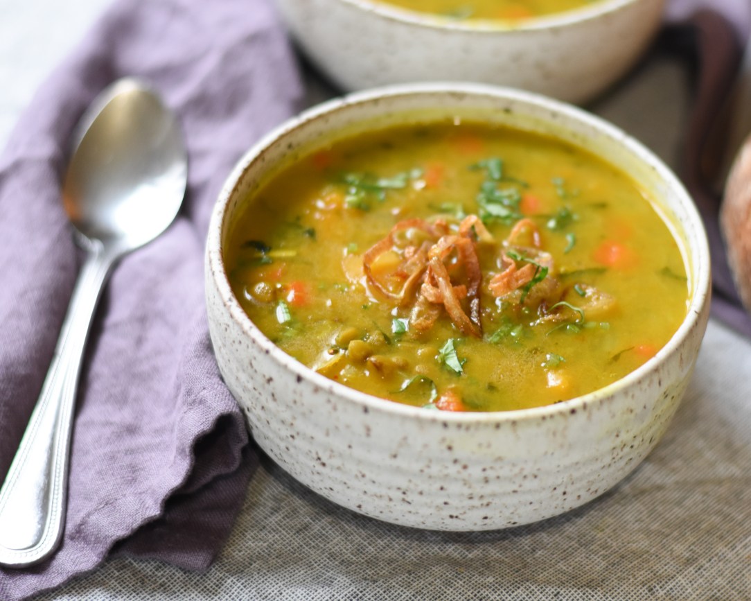 This is a hearty vegan soup, loosely inspired by flavors of Indian dal and curry. My sister’s mother-in-law brought Dave and I dal after Phillie was born. I loved how flavorful it was, especially from the cardamom pods. Later that fall I began experimenting with this soup recipe. It is very flavorful from spices like